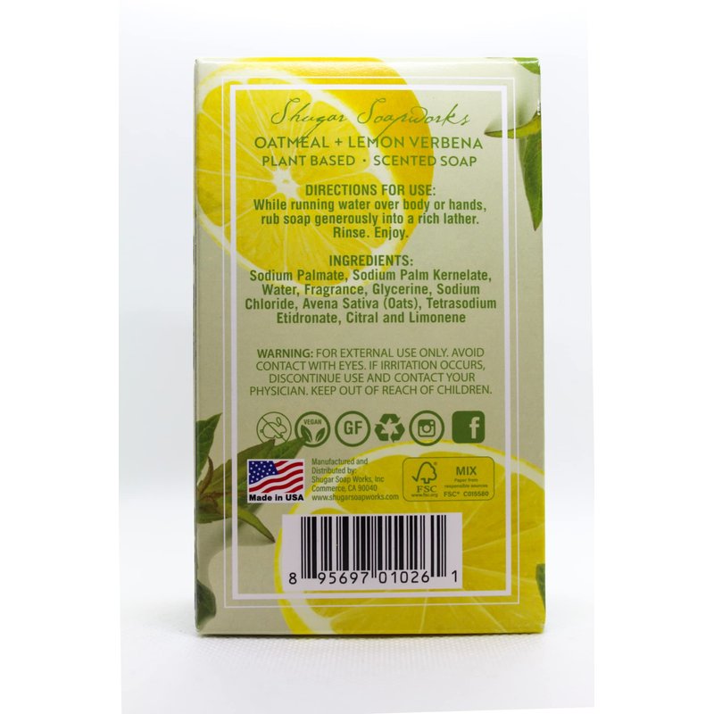 Shugar Soapworks Oatmeal & Lemon Verbena Plant Based Scented Soap 6.25 oz - 2 Bars One of our most popular soaps, Oatmeal & Verbena blends the crisp citrusy floral scent of verbena with the finely ground oatmeal flakes. This soap gently cleanses your skin leaving it smooth and toned, and is the perfect addition to your daily skin care routine. This vegan / plant based soap is Sulfate free and Paraben free,