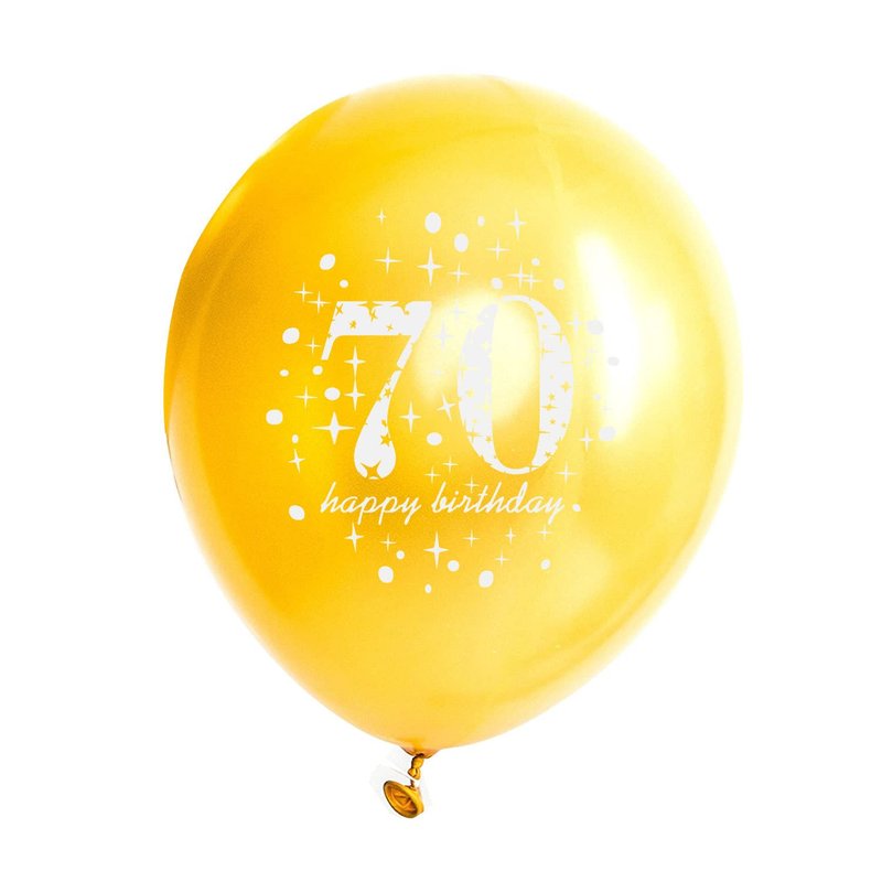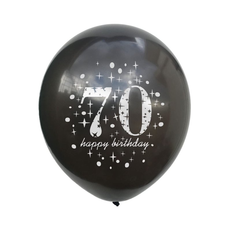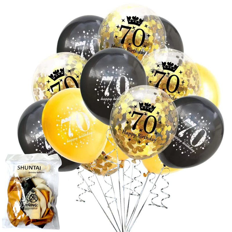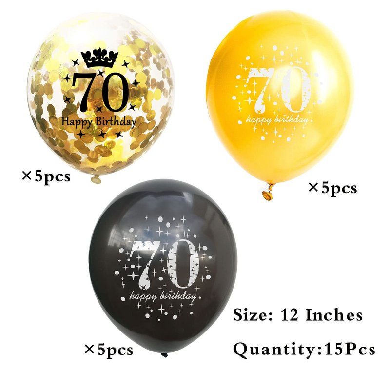 - Package:5 pieces 12 inch black latex balloon printed with the words "70 Happy Birthday",5 pieces 12 inch gold latex balloon printed with the words"70 Happy Birthday",5 piece 12 inch gold confetti balloons printed with the words"70 Happy Birthday", very suitable for 70th birthday party decorations