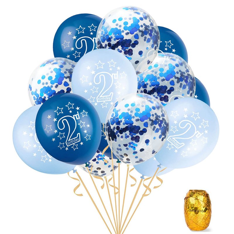 15 pieces Birthday Party Balloons Package:5 pieces 12 inch navy blue latex balloon printed with the words "2nd Birthday" 5 pieces 12 inch light blue latex balloon printed with the words"2nd Birthday"5 pieces 12 inch blue confetti latex balloons,coming with 1 roll ribbons.