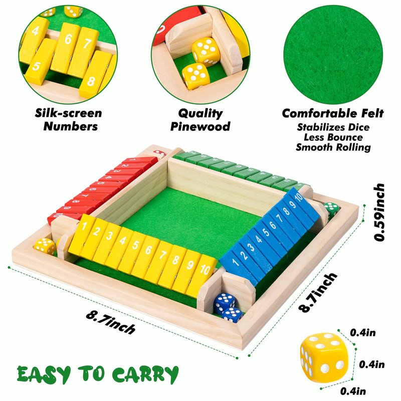 This 4 way wooden board game for 4 people is made of beautiful natural solid wood.Durable, scratch resistant, and environmentally friendly.In fact, happiness is so simple.Simple rules of the game, enjoy the thrilling moments of the Shut The Box Dice Game.MOST POPULAR ENTERTAINMENT TOYS. Simple rules of the game, but you can also customize the rules for family gatherings, as well as for classes, parties, picnics, birthdays, and bars, while enhancing the relationship between parents and children, teachers and students, friends, and learning to share, communicate, and socialize.Shut the box is made of solid pinewood. When the board game is going on, the felt surface reduces noise. Four different colors of silk screen technology dice ensure long term use.The size of shut the box is 8.74 8.74 1.1inch is easy to store and carry.It is easy to carry into any outdoor activity because of its light weight.Its perfect for home, classroom, parties, picnics, birthday, and bars.Enjoy the game whenever and wherever you please.