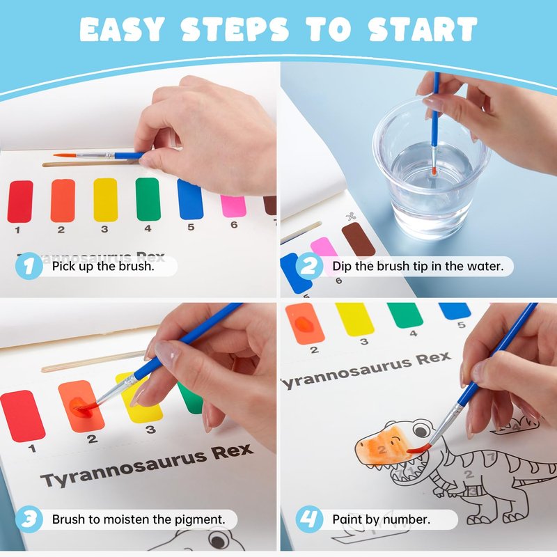 - 25 THEMED PAGES: This paint with water coloring book features 25 dinosaur-themed patterns. It comes with 2 paint brushes and an extra 5 pre-painted sheets for endless fun. Each page is pre-printed with paint palettes, ready for little artists aged 1-8 to start their painting adventure anytime, anywhere