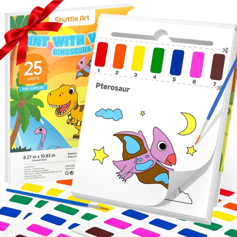 Shuttle Art Paint with Water Coloring Book for Kids, 25 Dinosaur Themed Pages with 2 Brushes, Mess-Free Watercolor Paint Set, Travel-Friendly Art Craft Gift for Toddlers, Birthday Christmas Gift