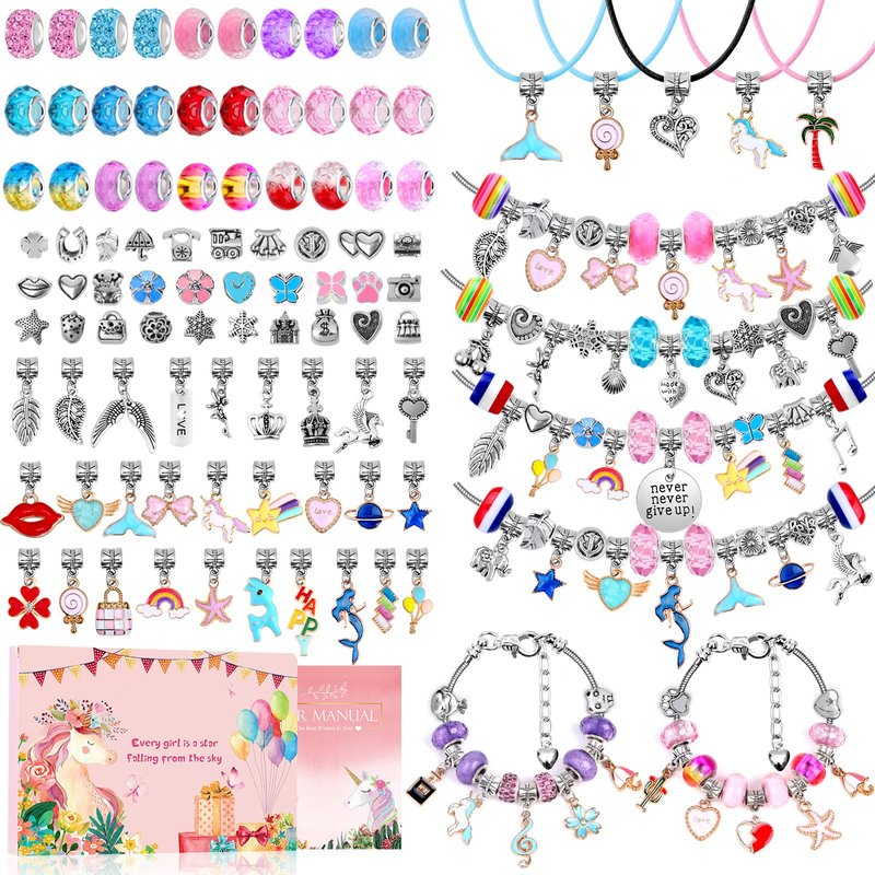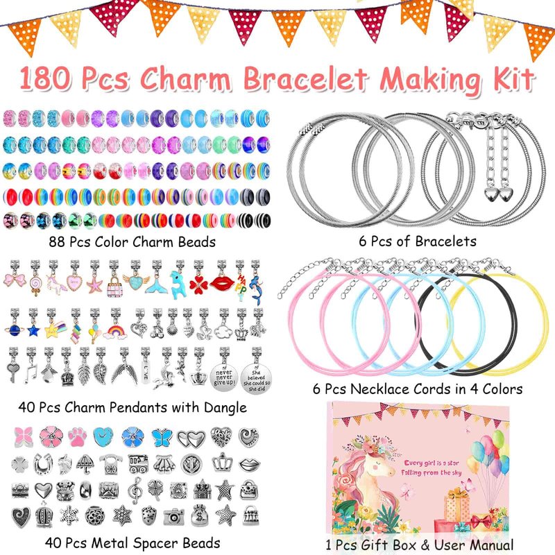 - 180 Pieces Charm Bracelet Kit Included: The DIY charm bracelet making kits for girls 8-12 provides you 6 pieces silver snake chain bracelets with extender chain, 6 necklace cords, 40pcs charm pendants, 88pcs European big hole color beads, 40pcs metal space beads, one gift box which enough for you to DIY your own jewelry craft and Cristmas and New Yeargift