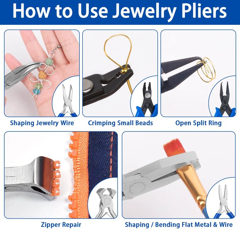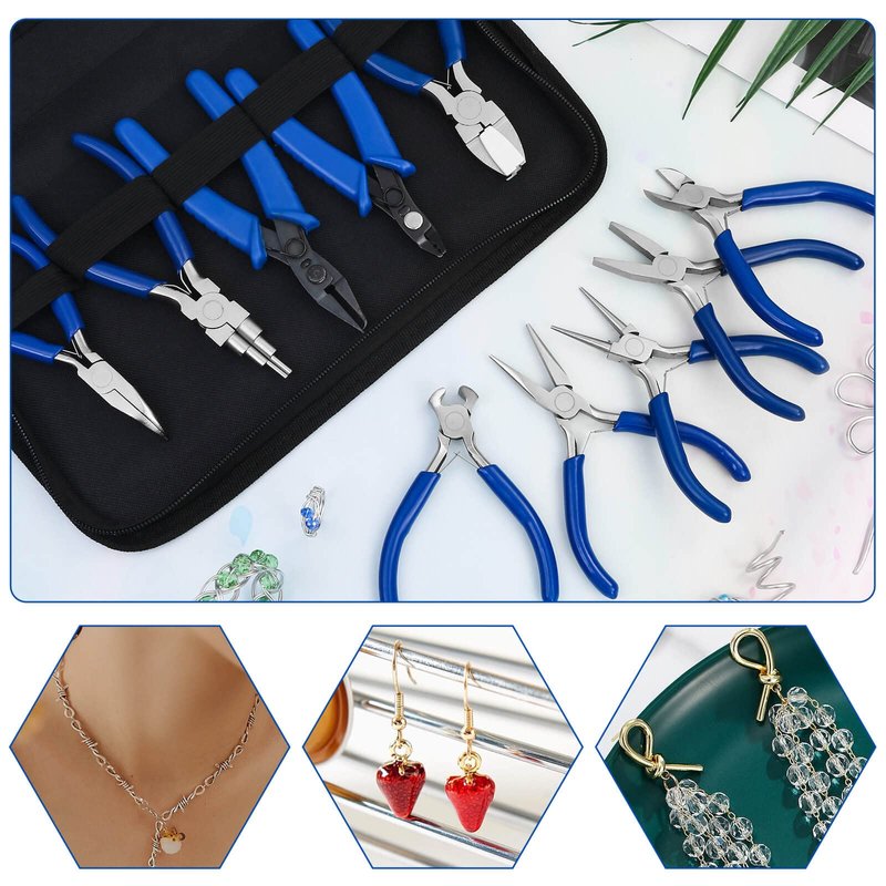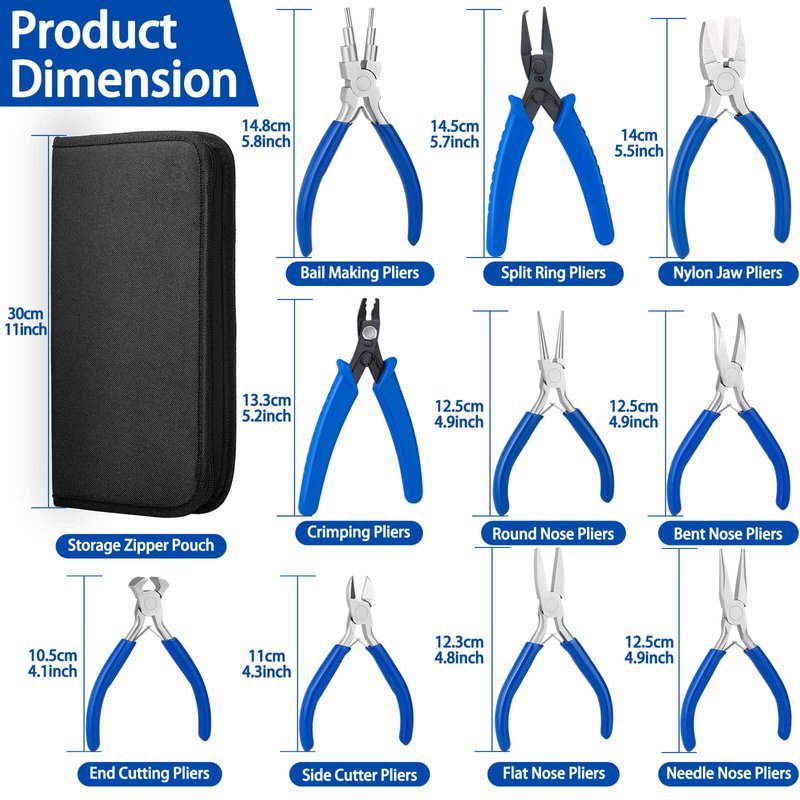 - 【Professional Jewelry Tools】 The jewelry making kit includes set of 10 jewelry pliers and a zipper storage punch. The jewelry tool set contains needle nose pliers, round nose pliers, bent nose pliers, bail making pliers, nylon jaw pliers, crimping pliers, end nippers, split ring pliers, flat nose pliers and wire cutters