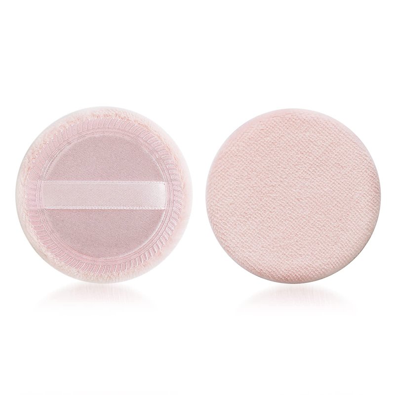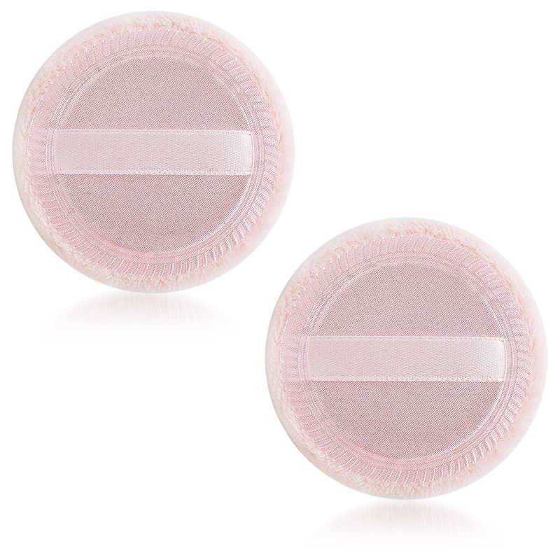 Sibba Loose Powder Puff 2 Pieces Round Velour Face Makeup Compact Body Container Setting Pressed Blending Foundation Cream Make Up Ribbon Strap Sponge Cushion Applicator (2 PCS Pink)