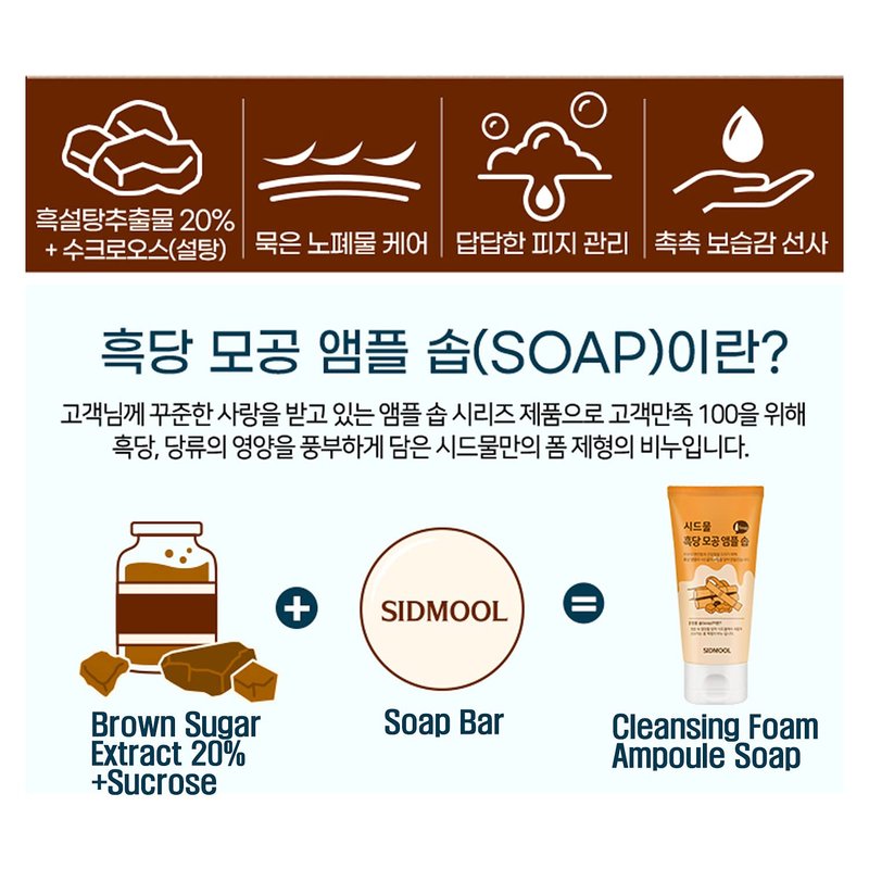 SIDMOOL BROWN SUGAR AMPOULE SOAP Low pH, 2 step cleansing solution Being low pH, close to the skin’s pH, it is deal for dissolving residue from deep inside the skin. The micro foam absorbs all skin impurities, makeup, and smoothly clears the residual waste in the pores How to use Apply an adequate amount of the cleansing foam on the skin and then gently spread the contents to cover the entire face, so that the product can absorb all the impurities. Add a moderate quantity of water, smoothly rubbing the foam. At the end remove the foam with lukewarm water. Use tip. For healthier skin, after cleansing, set the skin with toner and cotton pads.