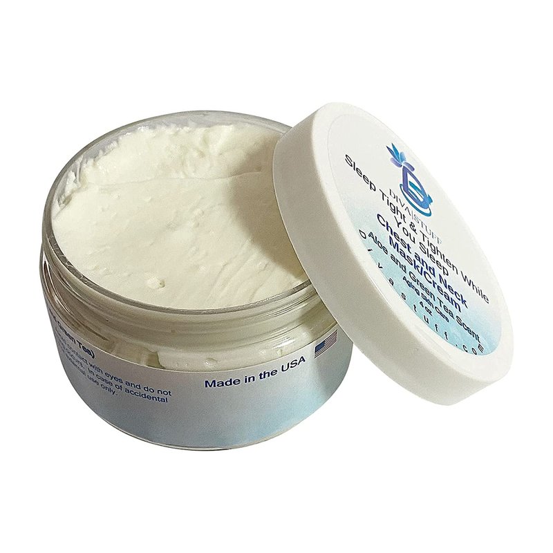 SIeep Tight and Tighten While You SIeep Chest and Neck Mask/Cream, With Hibiscus, Hyaluronic Acid,Firming Peptides, Black Goji Butter, Cranberry Enzymes and More, Aloe and Green Tea Scent, 4 oz By Diva Stuff