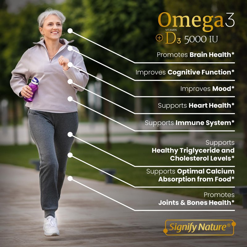 - DOUBLE ACTION OMEGA 3 & VITAMIN D3 BLEND: Elevate well-being with Signify Nature's Omega 3 supplement (Optimal Ratio of EPA DHA, EPA 350 mg + DHA 250 mg) promoting cardiovascular and brain health. Vitamin D3 (5000 IU) supports the immune system, bone health, and calcium absorption. Enjoy the benefits of triglyceride form of omega 3 fish oil. Free from PCBs, mercury, and heavy metals.
