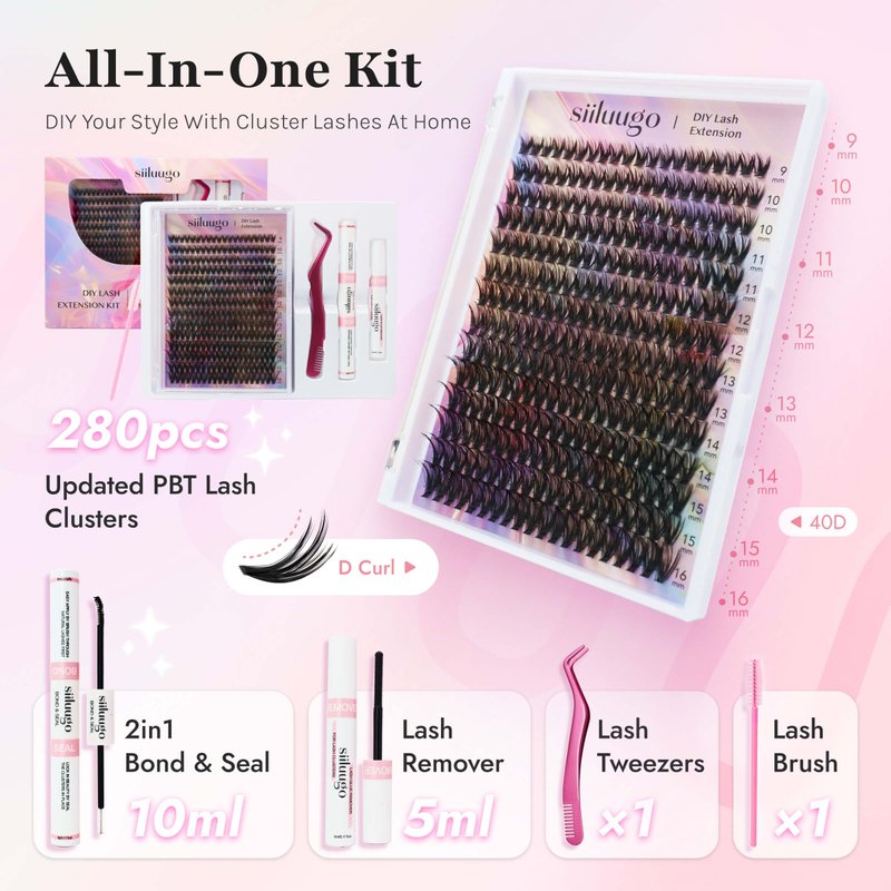 SIILUUGO DIY Lash Extensions Kit 280PCS Individual Lashes Clusters,9-16mm MIX 40D Fluffy and Natural False Eyelashes,Wispy and Volumn,with Lash Bond and Seal,Tweezers,Glue Remover,Easy Use At Home