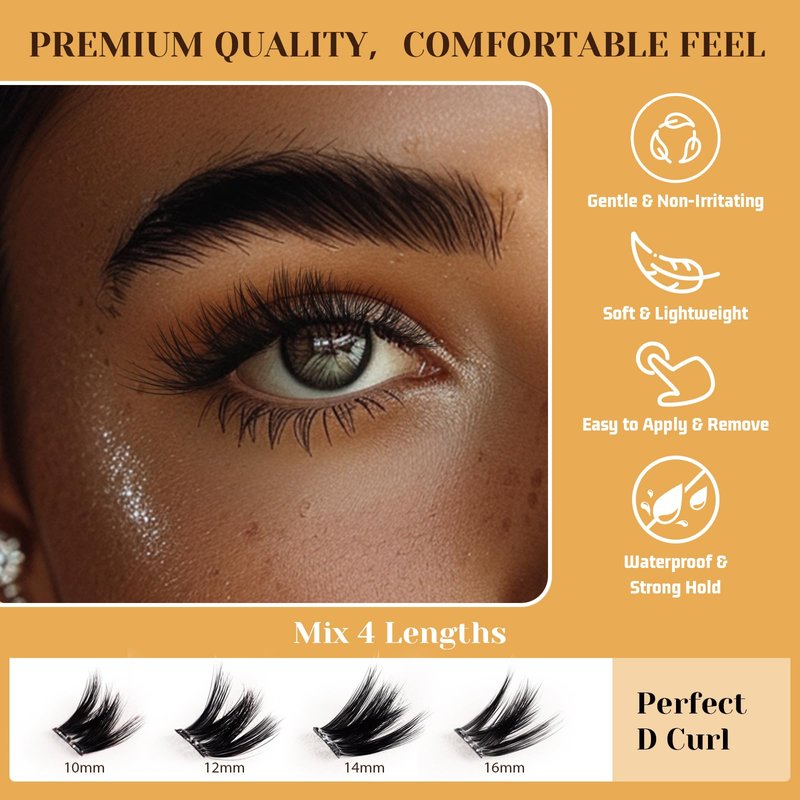 - 【Wispy Curly End No Glue Lashes Cluster】Experience the allure of fluffy lashes extension with our mink-like wispy eyelash cluster, flirty and soft. Press-on eyelash clusters featuring lengths ranging from 10mm to 16mm. This variety ensures a natural, yet voluminous look, enhancing your eyes with a perfect blend of depth and fullness.