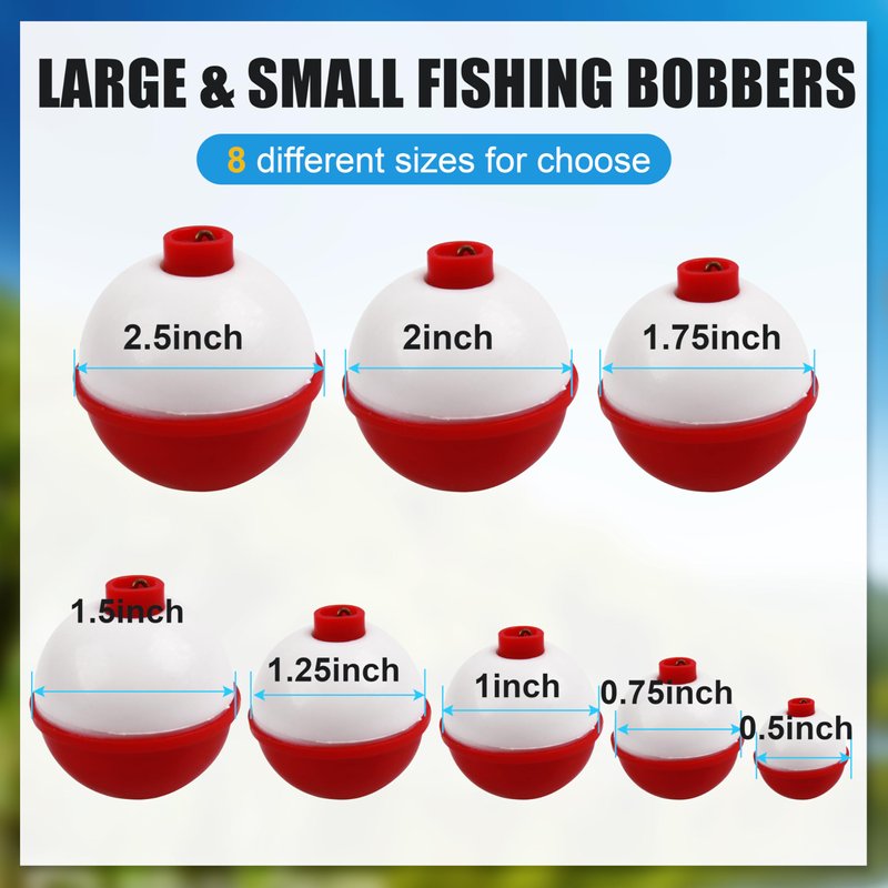 - FISHING BOBBERS ASSORTMENT: 25pcs/pack. Fishing Float Bobbers Size: 0.5inch, 0.75inch, 1inch, 1.25inch, 1.5inch ,2inch or 2.5inch, Perfect for Crappie, catfish, Panfish, Walleyes, Bass, Trout, Bluegill fishing etc.