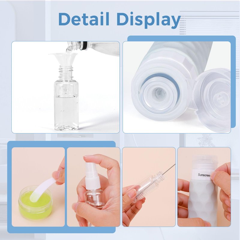 - 【16PCS Travel Toiletries Containers】This Travel Set includes 4 travel bottles, 4 travel jars, 2 spray bottles, 2 spoons, 1 funnel, 1 cleaning brush, and 1 printed label. It offers different accessories for your needs