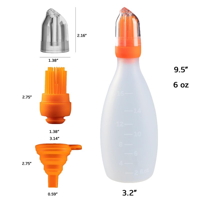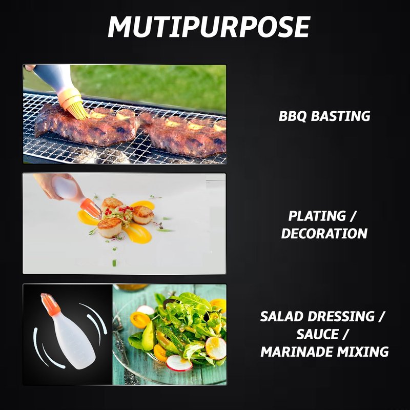 The Perfect All-in-One Grilling, Baking and Cooking Companion! Are you tired of struggling with messy, ineffective basting brushes while trying to infuse your dishes with mouthwatering flavors? Look no further! Our Silicone Basting Brush for Grilling with Oil Dispenser is here to elevate your cooking game and simplify your grilling experience. Say goodbye to guesswork and messy spills! 100% secured lid, no leaking! Our baster brush comes with a built-in oil dispenser, allowing you to precisely control the amount of oil or marinade you apply to your food. Achieve even, consistent results effortlessly! Our kitchen brush for cooking is crafted from high-quality 100% food-grade silicone, BPA Free. This basting mop brush is heat-resistant up to 600° F. The sauce brush for grilling are designed to withstand high temperatures, ensuring it won't warp or melt during cooking. These versatile silicone brushes are not just for basting! Use it as a BBQ grilling brush to add delectable sauces to your grilled masterpieces or as a BBQ mop to enhance flavors further. Its multi-functionality makes it an essential tool in your kitchen arsenal. This silicone baster brushes also has a huge capacity bottle (16 fl oz) so you don't need to refill as often. Also, the silicone material repels residue and is dishwasher-safe, saving you valuable time and effort after a delightful cooking session. Cleaning up is a breeze! Available in Vibrant Orange and Black Color. Our silicone basting brush for grilling is a fantastic gift idea for the men and women in your life who love to cook and grill. Make every cooking endeavor a delightful and mess-free experience with our Silicone Oil Brush dispenser for cooking. From saucing succulent ribs to brushing veggies with marinades, this barbecue brush for sauce will become your trusted partner in the kitchen and at the grill. Get yours now!