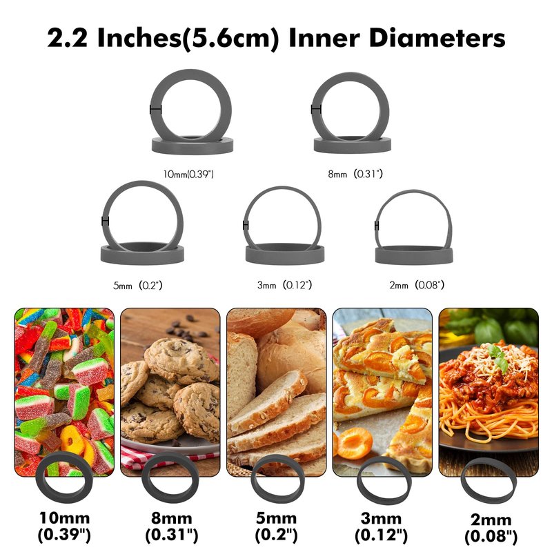 - 【Clear Measurement Guide】There are 5 sizes of the rolling pin thickness rings: 2mm(0.08”), 3mm(0.12”), 5mm(0.2”), 8mm(0.31”), 10mm(0.39”), which is embossed on the inner side of each silicone ring. With the adjustable dough rings, it is easy to roll out dough to the expected even thickness and produce evenly baked bread, biscuit, pie top, tart base, chapatti, dumplings and noodles like pasta.