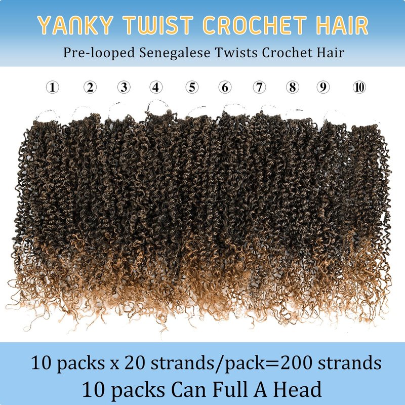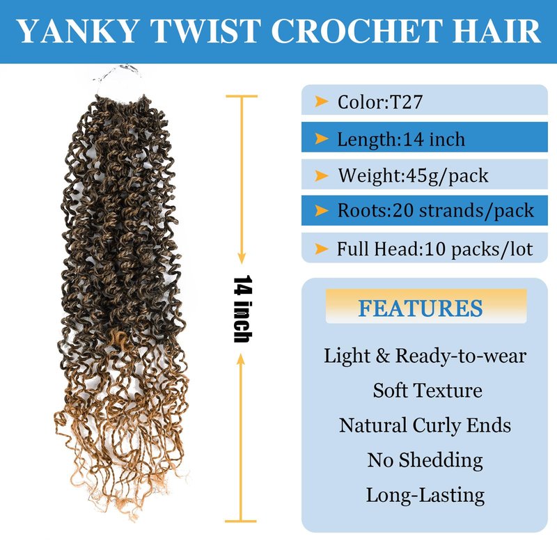 - Yanky Twist Crochet Braids Hair Extension:Multiple Colors To Choose From, 1b, Tgrey, t27, t30. Currently, There Are Two Sizes To Choose From, 10 Inches And 14 Inches. 20 Pieces/Pack, 10 Packs/Batch. Generally Speaking, 8-10 Packs Are Enough To Make a Full Hairstyle.
