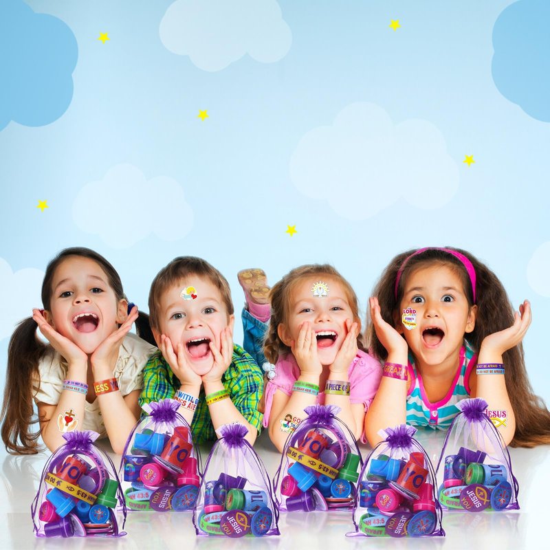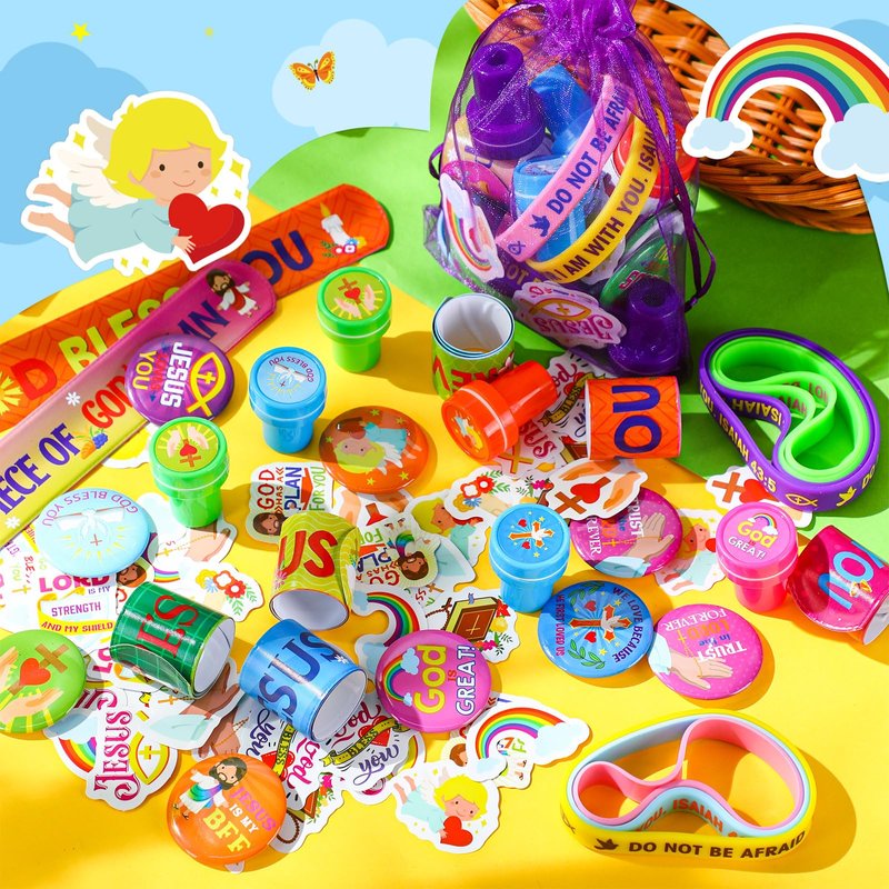 - Jesus Party Favors Set: The package included 12 christian stampers, 12 religious rubber bracelets, 12 religious button pins, 12 religious slap bracelets, 12 organza bags and 50 religious stickers. They can be a meaningful party gift give for 12 guests