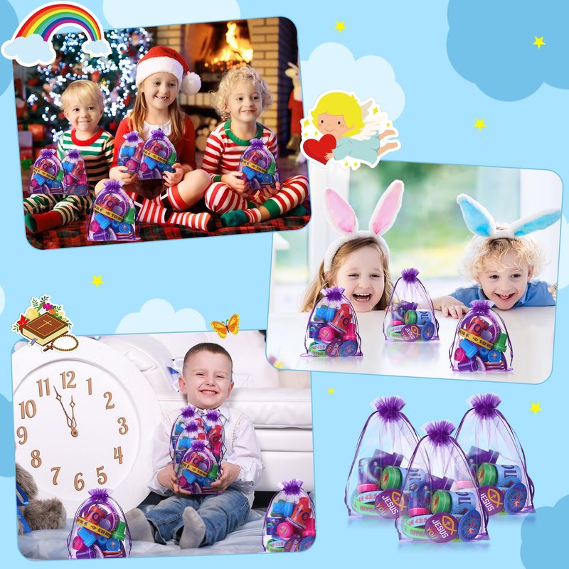 Feature: Religious party favors: Ensure a memorable and faith-filled celebration with our distinctly crafted Christian Party Favors Set. This set is particularly designed, keeping an emphasis on quality, devotion, and vibrant creativity, so that every interaction with these items cultivates love and appreciation for the Christian faith among your young celebrants. They infuse fun with faith, showcasing religious imagery and scripture verses that reinforce Christian tenets. Basic information: Size: as shown in pic Quantity: 110 Color: colorful Material: plastic, rubber, paper Package included: 12 x Religious stampers 12 x Bible verse rubber bracelets 12 x Christian button pins 12 x Christian slap bracelets 50 x Christian stickers(5 Sheets) 12 x Purple organza bags Warm note: Manual measurement, there may be slight differences in size. Due to the screen display, the color of the item may differ slightly from the picture.