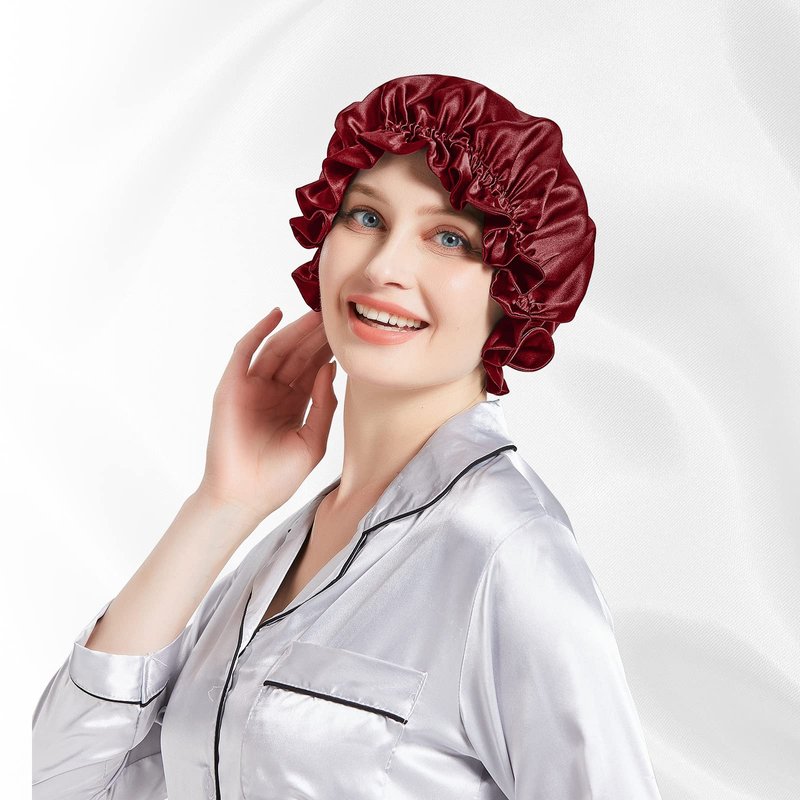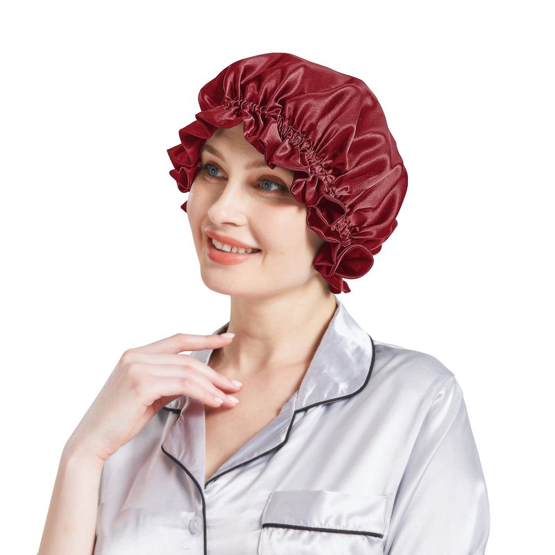 Silk Bonnet for Hair Care, Natural Silk Cap for Sleeping and Shower, Double-Lined, 6A-grade Mulberry Silk Turban Red Wine