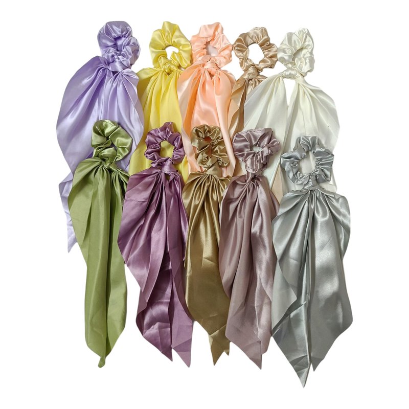 - Elegant Design: Each scrunchie is adorned with an elegant satin bow, available in both Eng (English) and Pestal color accents, offering sophistication and versatility to complement various outfits and hairstyles.