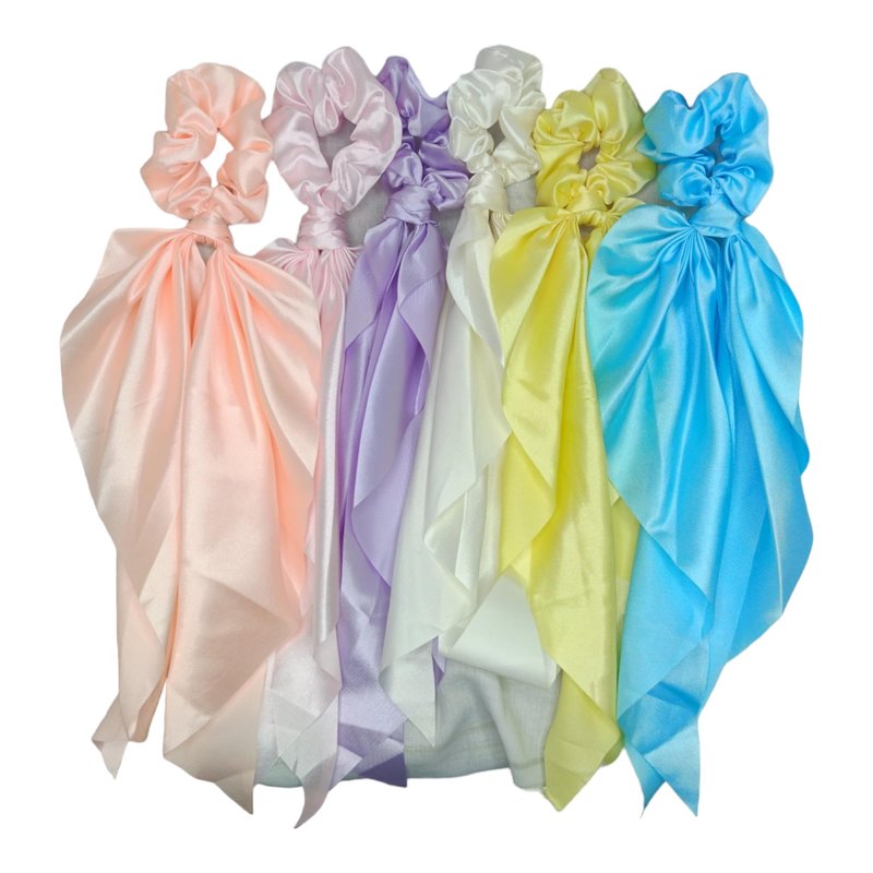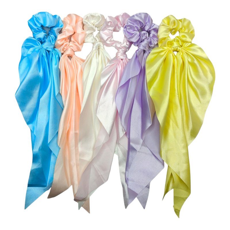 - Set of 6: This set includes six hair scarf scrunchies, each adorned with an elegant satin bow in pestal colors, providing a variety of styling options to suit different outfits and occasions.