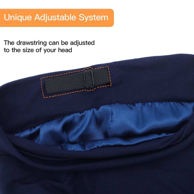 Silk Satin Lined Bonnet Sleep Cap - Adjustable Stay on All Night Hair Wrap Cover Slouchy Beanie for Curly Hair Protection for Women and Men - Solid Navy