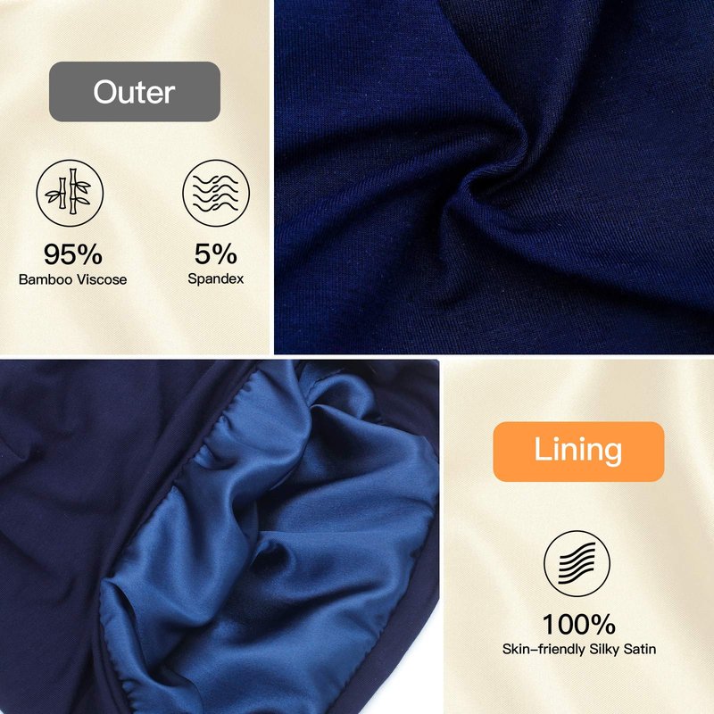 - PERFECT FOR HAIR PROTECTION & BEAUTY - With the silky satin lining, our sleep cap will effectively protect your hair from tangles, frizz, breakage and keep moistured overnight. The outer fabric is specially developed with bamboo fibers, which is breathable, soft and lightweight & will not easily absorb the moisture from your hair like cotton. Our double layer designed sleep cap is strictly complied with high dying standard , with our hair bonnet beanie, no worry for fading and bleeding problem.