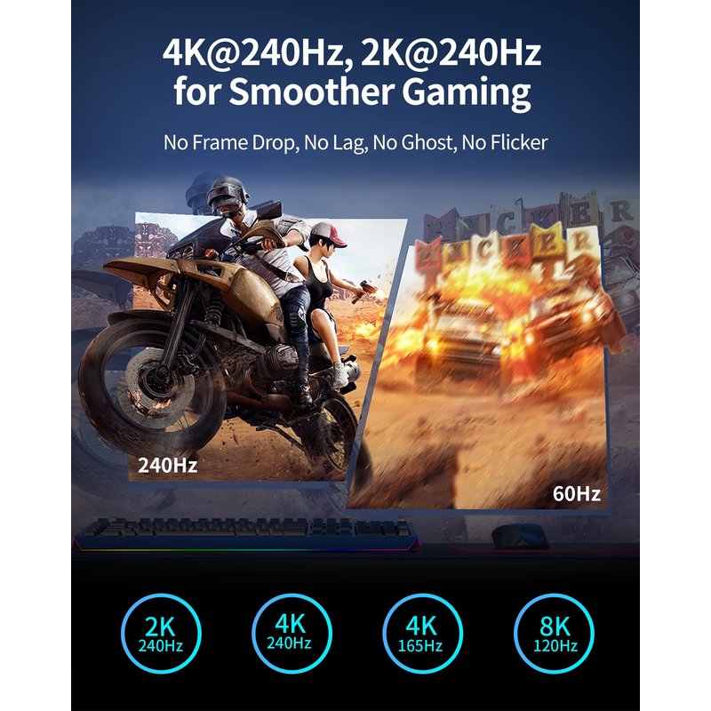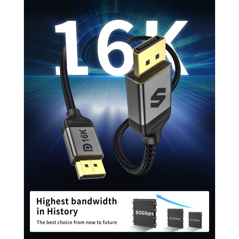 Silkland 8K Displayport Cable 2.1/2.0 supports high resolutions 16K(15360*8640)@60Hz with DSC, 8K@120Hz, 4K@240Hz/165Hz/120Hz/144Hz, 2K@360Hz.Supports all popular graphics cards and monitors.