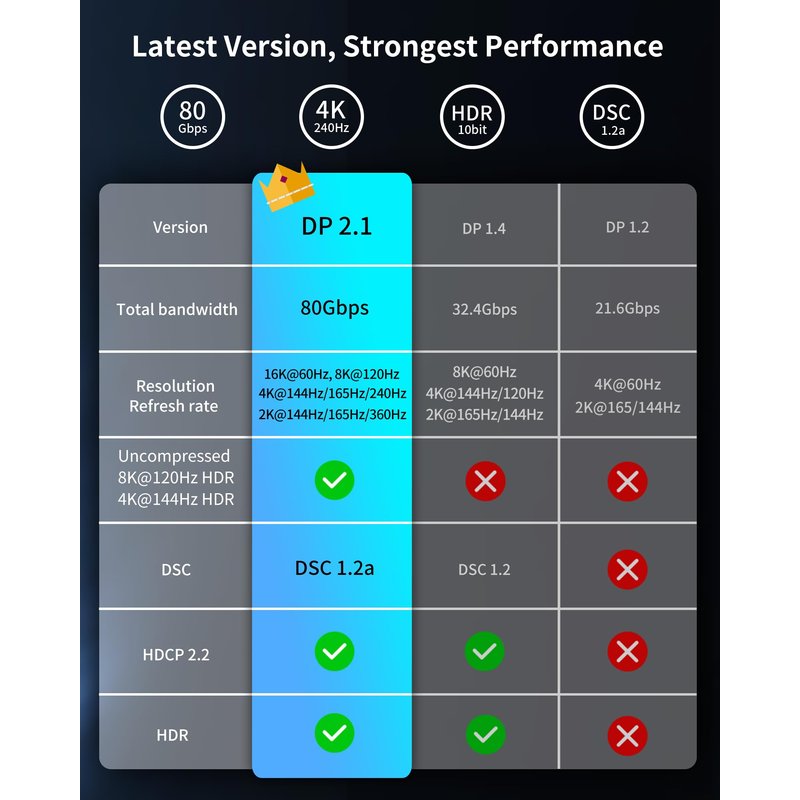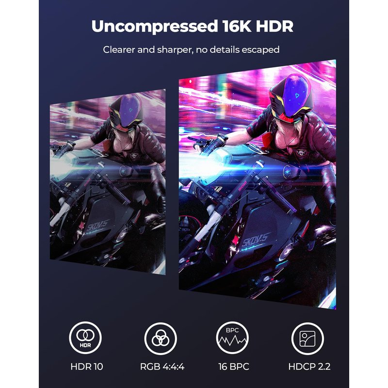 Unlike 4K/8K DP cables, 16K displayport 2.1 can provide 80Gbps bandwidth, HBR3, DSC 1.2a. Dynamic HDR enhances dark scenes and details. The 32-bit audio captures enemy footsteps and breathing, especially in FPS and 3A masterpieces.
