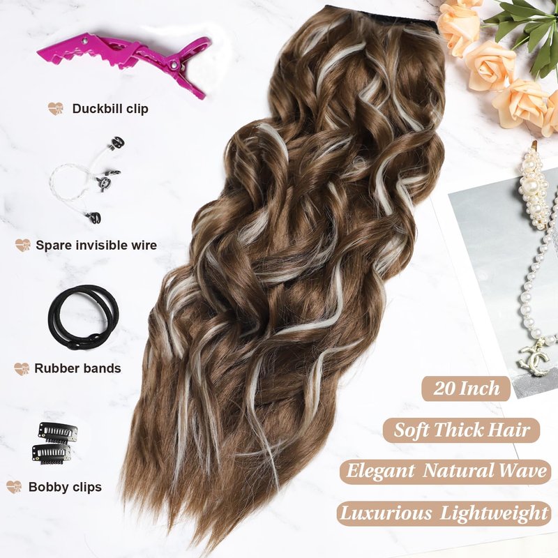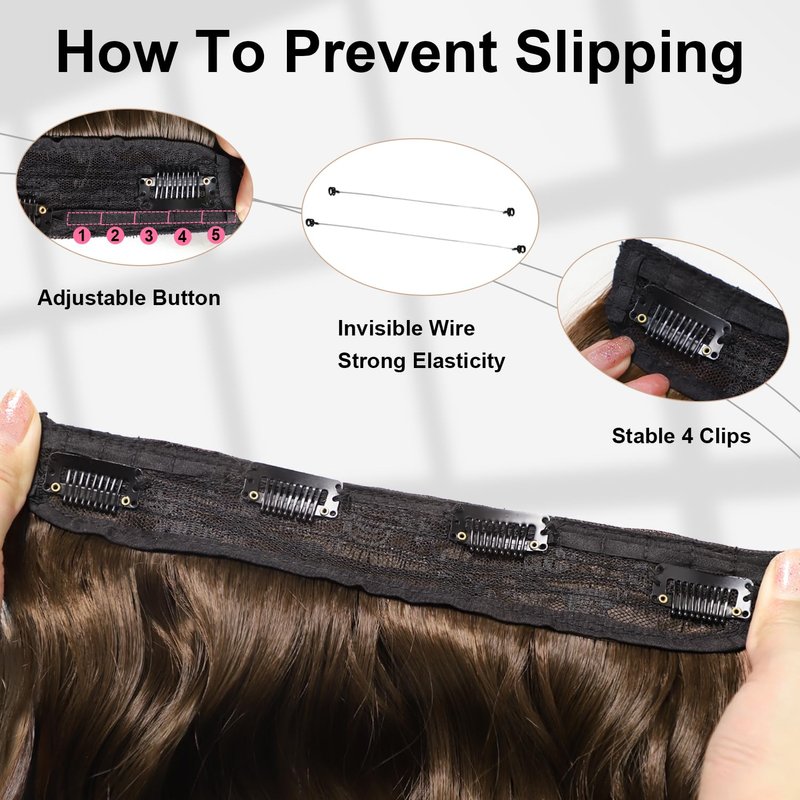 - 1. Adjustable, Stable ,Natural:Invisible wire hair extensions are designed with 4 bobby clips, which can not only fix it, but also make the soft lace band fit smoothly on your scalp. Invisible elastic wire can be easily covered by hair naturally. There are 10 small notches to adjust the length to suit different head sizes.Japanese technology heat-friendly synthetic fibers, natural-looking, soft feel,lightweight.