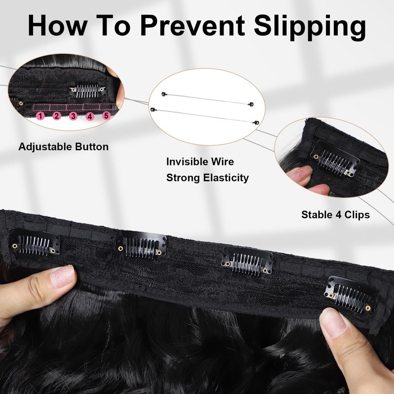 - 1. Adjustable, Stable ,Natural:Invisible wire hair extensions are designed with 4 bobby clips, which can not only fix it, but also make the soft lace band fit smoothly on your scalp. Invisible elastic wire can be easily covered by hair naturally. There are 10 small notches to adjust the length to suit different head sizes.Japanese technology heat-friendly synthetic fibers, natural-looking, soft feel,lightweight.