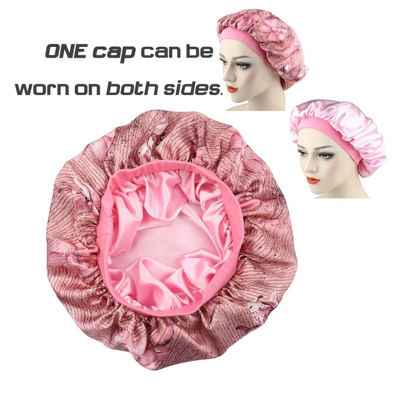 - DOUBLE-LAYERED SILKY SATIN. Reversible and Versatile. This night cap reduces friction unlike previous single-layered satin cap having rough lining without satin lined.Two options for you.You can wear fashionable printed satin inside or simple dyed satin inside.Both layers are silky satin fabric.This product can be worn not only during sleep,but also for makeup, bathing,or even doing the housework.It is really convenient in daily use.