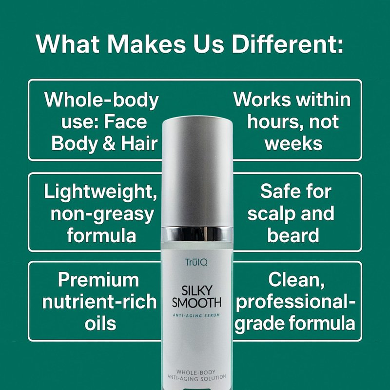 - Whole-Body Anti-Aging Solution: More than a face serum—Silky Smooth is a professional-grade anti-aging formula designed to revitalize skin and hair from head to toe. Use it on your face, neck, hands, arms, legs, and even scalp.