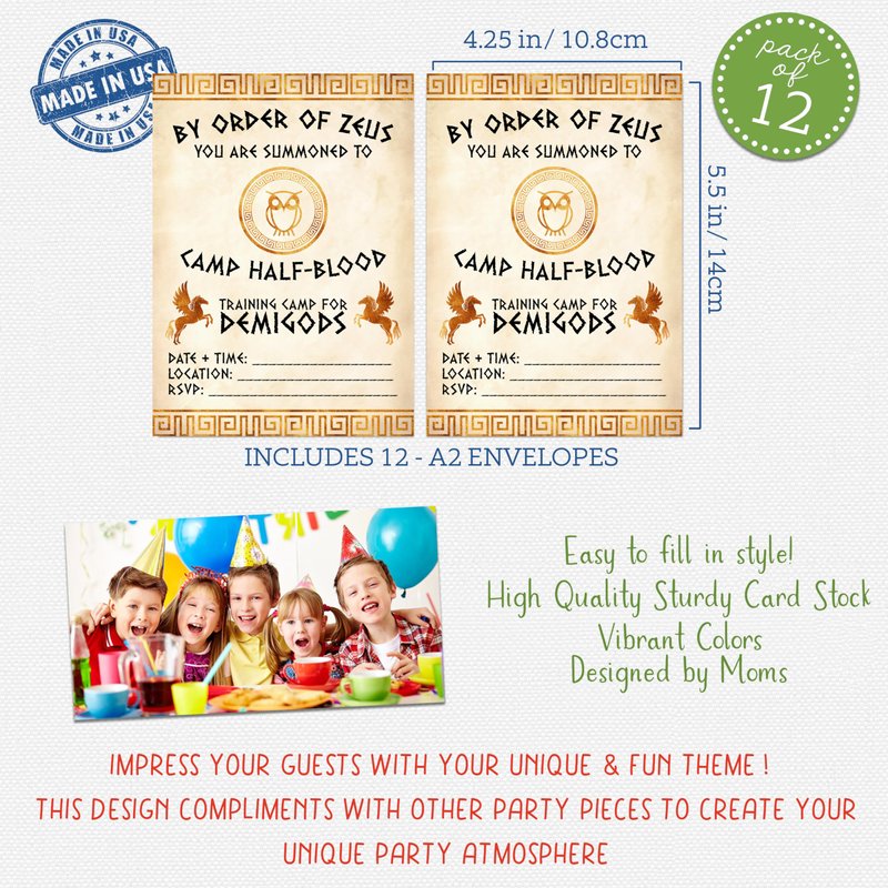 By Order of Zeus You Are Summoned - Greek Mythology Book Themed Kids Party Supply - Camp Half Blood Training Camp for Demigods. Set includes 12 invites and 12 envelopes. Simple to fill in your product details. Blank on the backside for added space. Made in the USA - Designed by Moms
