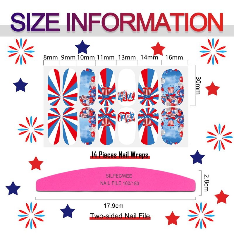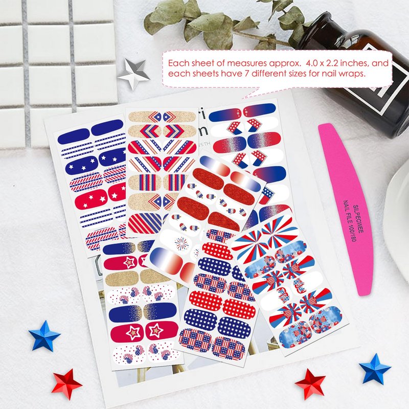 - Package Content - 15 sheets 4th of July nail strips + 1pc nail file. each sheet of measures approx. 10 x 5.5 cm/ 4 x 2.2 inches, total 210 pieces and 7 different sizes, a variety of styles and color, let you always keep gorgeous nails.