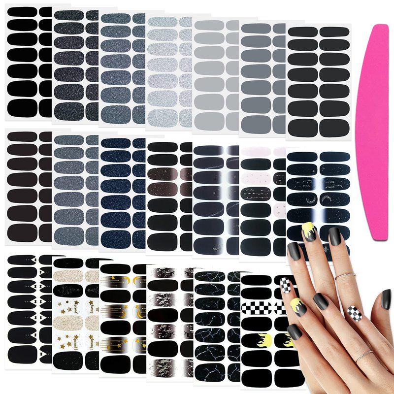 SILPECWEE 20 Sheets Black Style Nail Wraps for Women Stick on Nail Polish Strips Glitter Solid Color Self Adhesive Nail Polish Stickers Fingernail Manicure Sticker Nail Art with 1pc Nail File