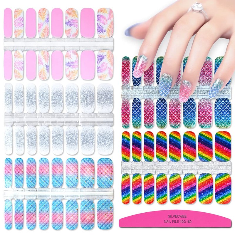 SILPECWEE 5 Sheets Nail Polish Strips Rainbow Glitter Adhesive Nail Stickers Full Nail Wraps Nail Strips for Women Nail Accessories with 1pc Nail File