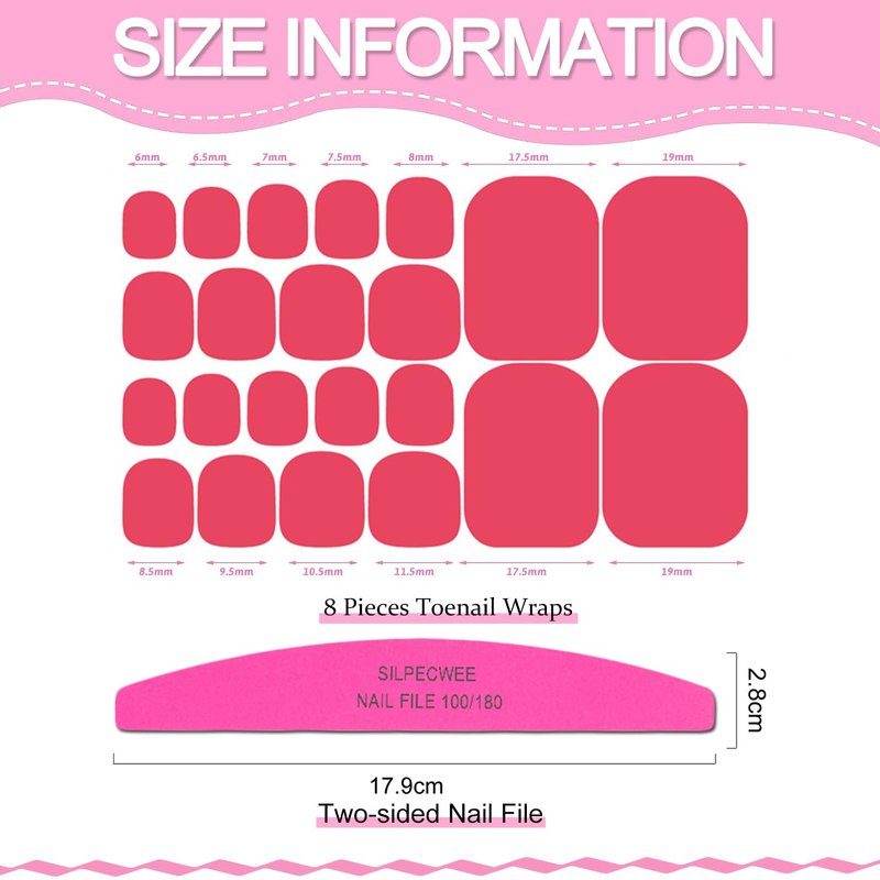- Package Content - 8 sheets toe nail strips + 1pc nail file. each sheet of measures approx. 10 x 5.5 cm/ 4 x 2.2 inches, total 176 pieces and 11 different sizes, convenient to carry and store without taking up much space.