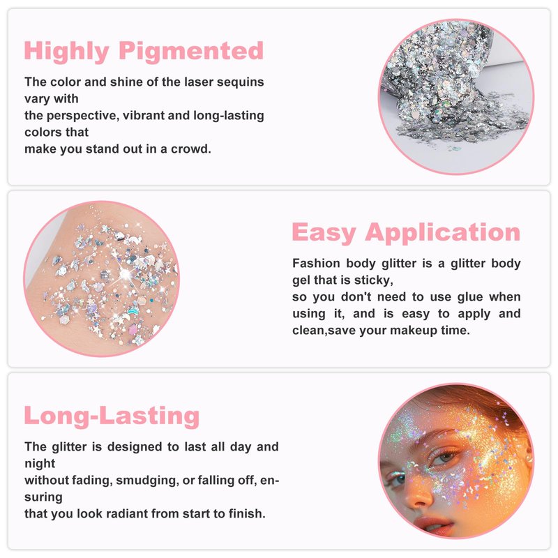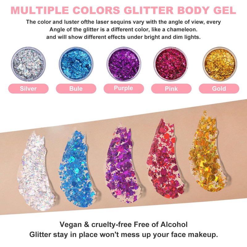 - Long Lasting Body Glitter Gel: Elevate your look to dazzling heights with Our premium makeup glitter gel, the color and shine of the laser sequins vary with the perspective, The face glitter gel keeps all day and night, even through dancing and sweating.Body Glitter Gel always adheres comfortably to your skin,make you be the most attractive at the Party;Atteniton: Quick-drying formula,once opened,it must be used up as soon as possible, as it dries out easily when exposed to air.