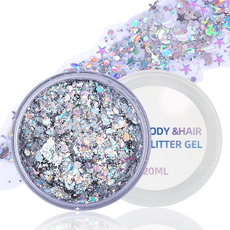 Silver Body Glitter,Face and Body Glitter Gel, Hair Glitter Gel, Glitter Gel Makeup, Glitter for Face and Hair,Festival Rave Body Glitter,Chunky Hair Sparkling Halloween Glitter Gel for Women