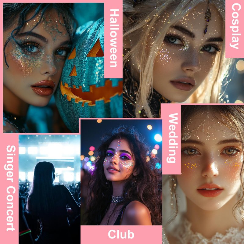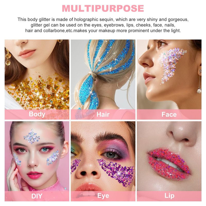 - Easy Application and Remove:Our amazing glitter doesn't require any extra adhesive. Apply the gel-based glitter directly onto your skin, spread it with your fingertips, and let it dry for a moment. It will last all day without any hassle, And the face glitter gel easy to remove using soap, warm water, or makeup remover, without causing irritation.