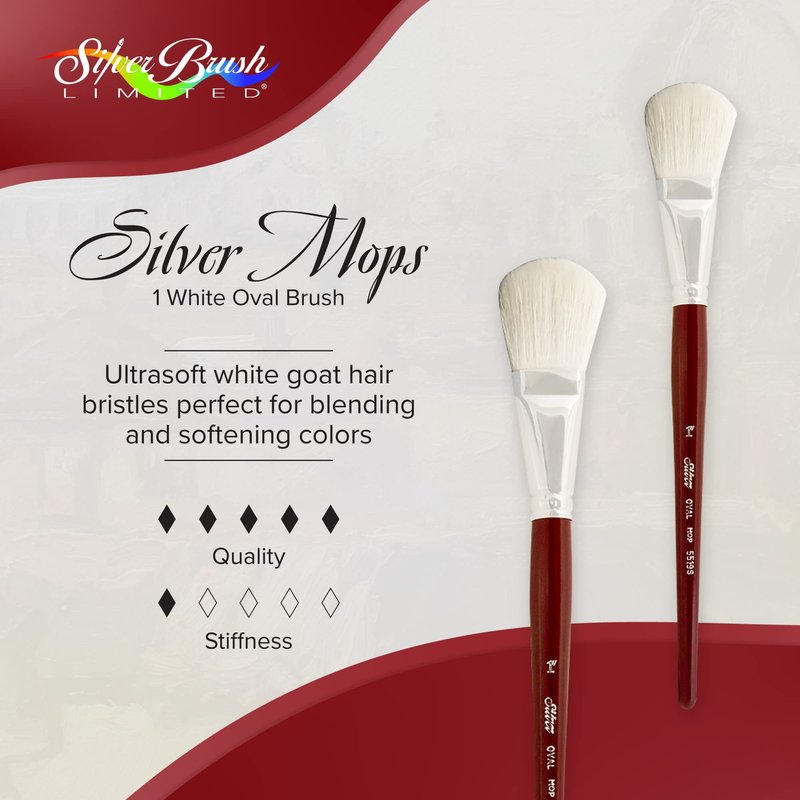 - SILVER MOP BRUSH: Each paintbrush in our Silver Mop line features ultrasoft goat-hair bristles. It is perfect for blending and softening color with oils and acrylics or creating backgrounds and sky washes with watercolors.