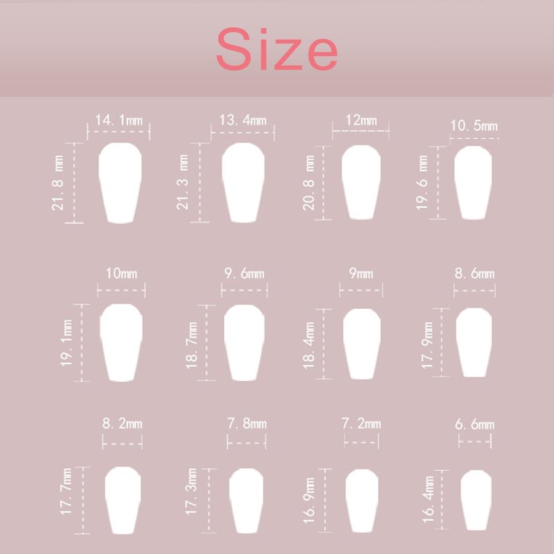 - 【Package & DIY Nails】You'll get 24 false nails in 12 sizes. 1 mini nail file, 1 small wooden stick, 1 piece of adhesive tab glue. You can safely choose a fake nail that fits your finger size and DIY your desired nail shape.