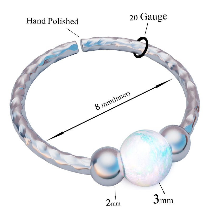 Silver Nose Ring - Dainty 8mm Hoop 20 Gauge Hammered Piercing – 3mm Fire White Opal - Snug 925 Sterling Silver Nose Piercings – Body Jewelry Piercing Hoops – Gift Ready Purchase
