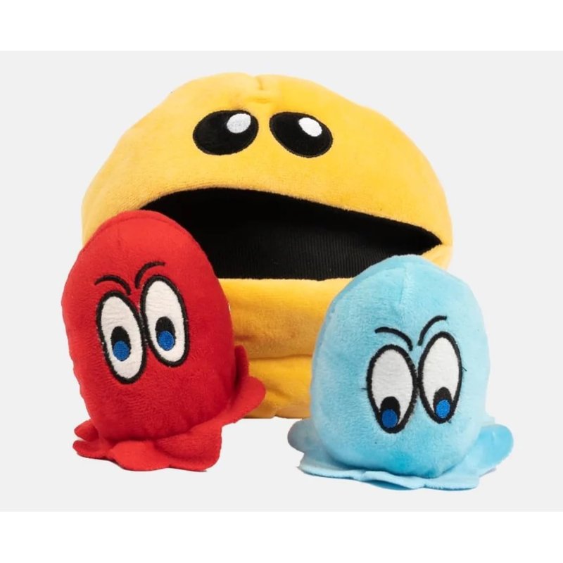 "Snackman" 3-in-1 dog toy. This fun, familiar throwback to gaming toy is sure to be a favorite of your pup's (and yours!). Featuring soft sueded plush, and embroidered for safety features, the ghosts have squeakers & pop in/out of "Snackman's" mouth which has crinkle paper effects. Measures approximately 7" tall; ghosts, 4".