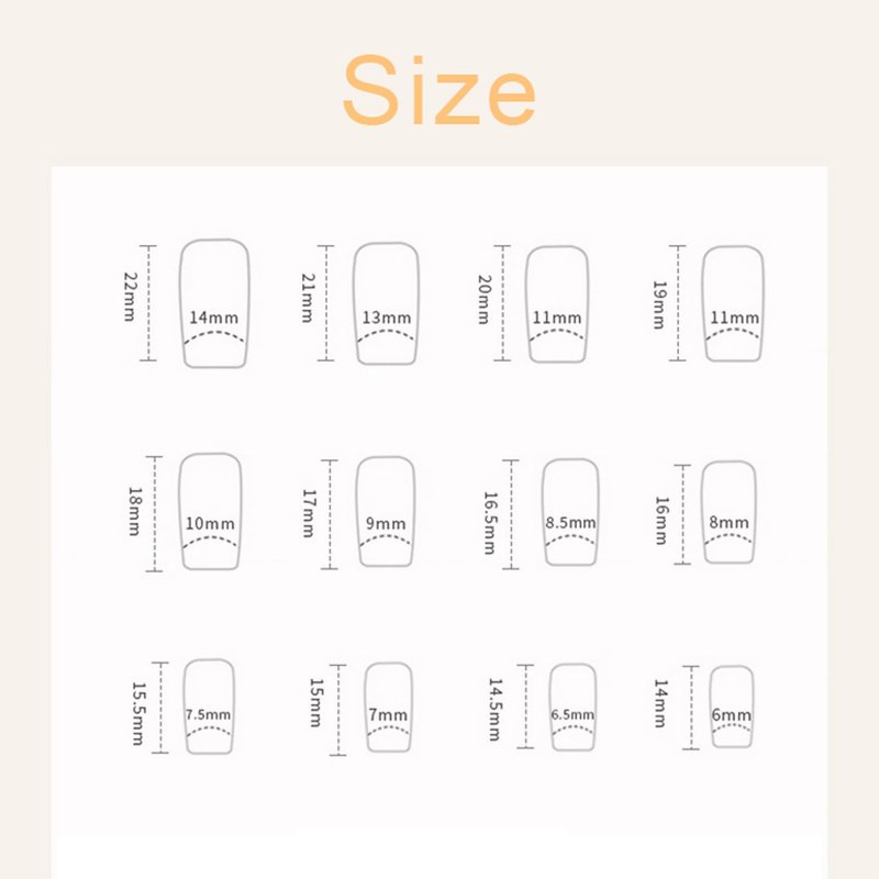 - 【Package】: There are 24pcs of medium square artificial finger nails 12different sizes, 1 mini nail file, 1 small wooden stick, 1 nail sticker in the package.(Jelly glue doesn't last as long as liquid glue, but it can make fake nails reusable. Please use suitable glue according to different occasions).