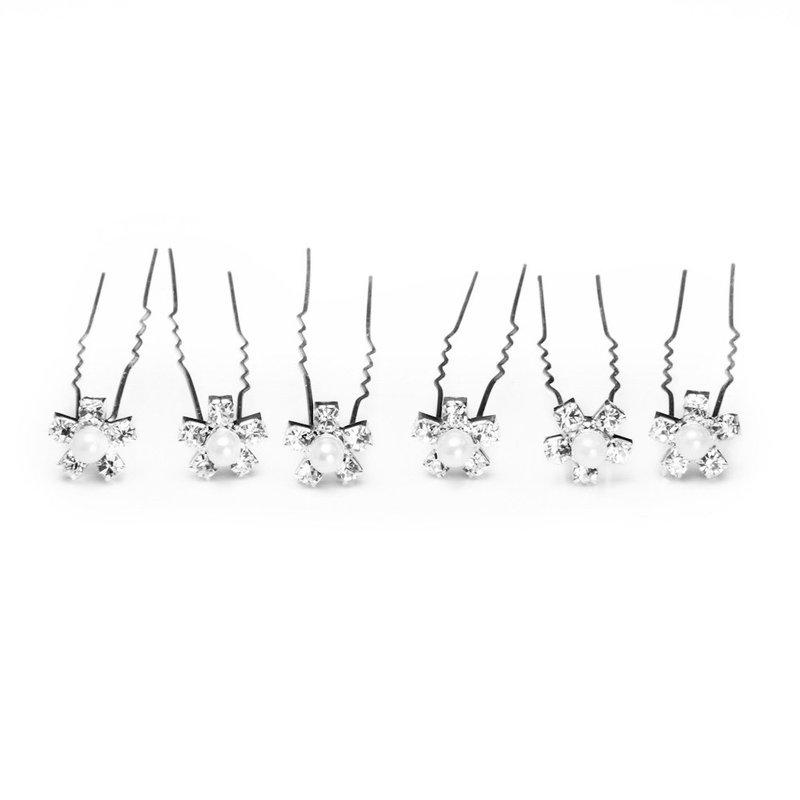 These flower hair pins have of 5 sparkling clear rhinestones surrounding a white faux pearl. Perfect accessory for any wedding, prom, bride, bridesmaid, flower girl, or any other special occasion. Sold as a set of 6.