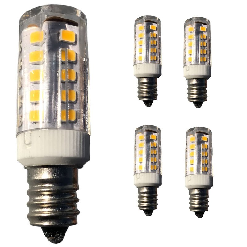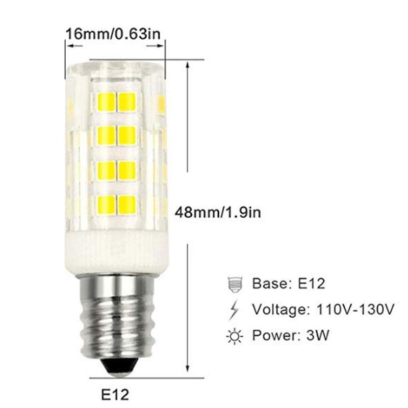 - _ Standard E12 edison base very easy to replace halogen bulbs with E12 candelabra base. Instant on to full brightness,no flicker,no buzzing sound. _ Featured first-class high quality 52 pcs 2835SMD lamp beads and high quality PC cover, 330 lumens CRI>80 Ra, Enough to brighten your living room, bedroom, kitchen, hallways and more.