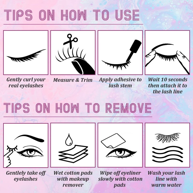 - 【Easy to use】Carefully hold the root of the false eyelash with tweezers, remove it from the adhesive strip, place it on a flat place to adjust the angle,hold the middle of the eyelash with tweezers, apply the glue to the root of the eyelash,wait 10 seconds, and then stick it on your own eyelash.