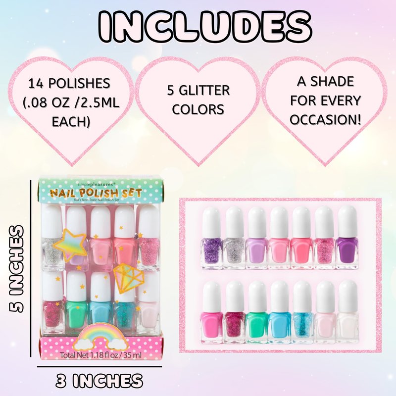 - This Simple Pleasures set of 14 sparkly shades is perfect for your little one's nails. With a range of colors spanning the entire spectrum, you're sure to find the perfect match for any outfit! Three of the colors have a glittery sheen, adding an extra touch of glamour.