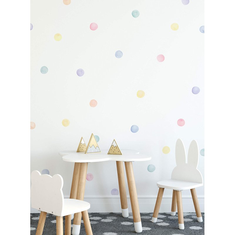 Our Pastel Watercolor Dots Wall Stickers add a touch of playful whimsy to modern vintage-styled rooms. Each set includes 60 dots. [Size] Dot Size: 3" [What's Included] (60) Dots